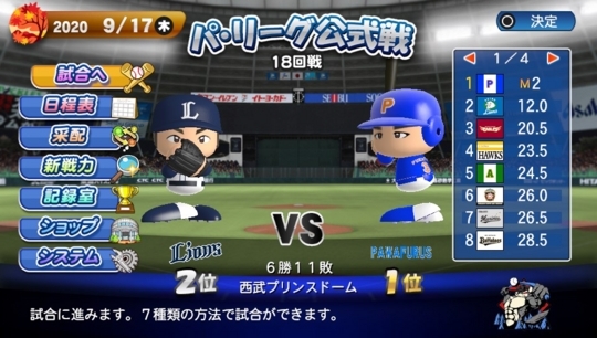 9月17日、マジック2の状態で2位のライオンズと対戦です。