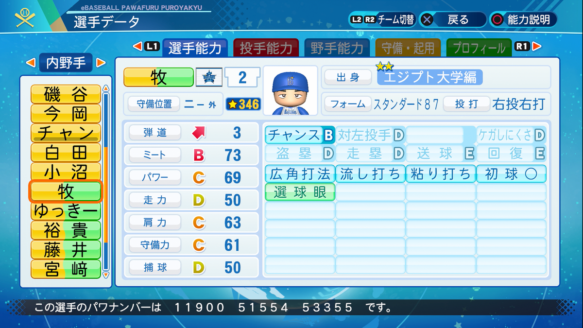 2021-04-09 パワプロ2021で牧秀悟選手を作った パワプロ2020 パワプロ2020が2021年度選手データ版にアップデートされたのですが、公式の牧秀悟選手には一塁のサブポジが付いておらず、能力も低めだったのでそれっぽく作ってみました。 良かったら使ってください。 パワナンバー:11900 51554 53355